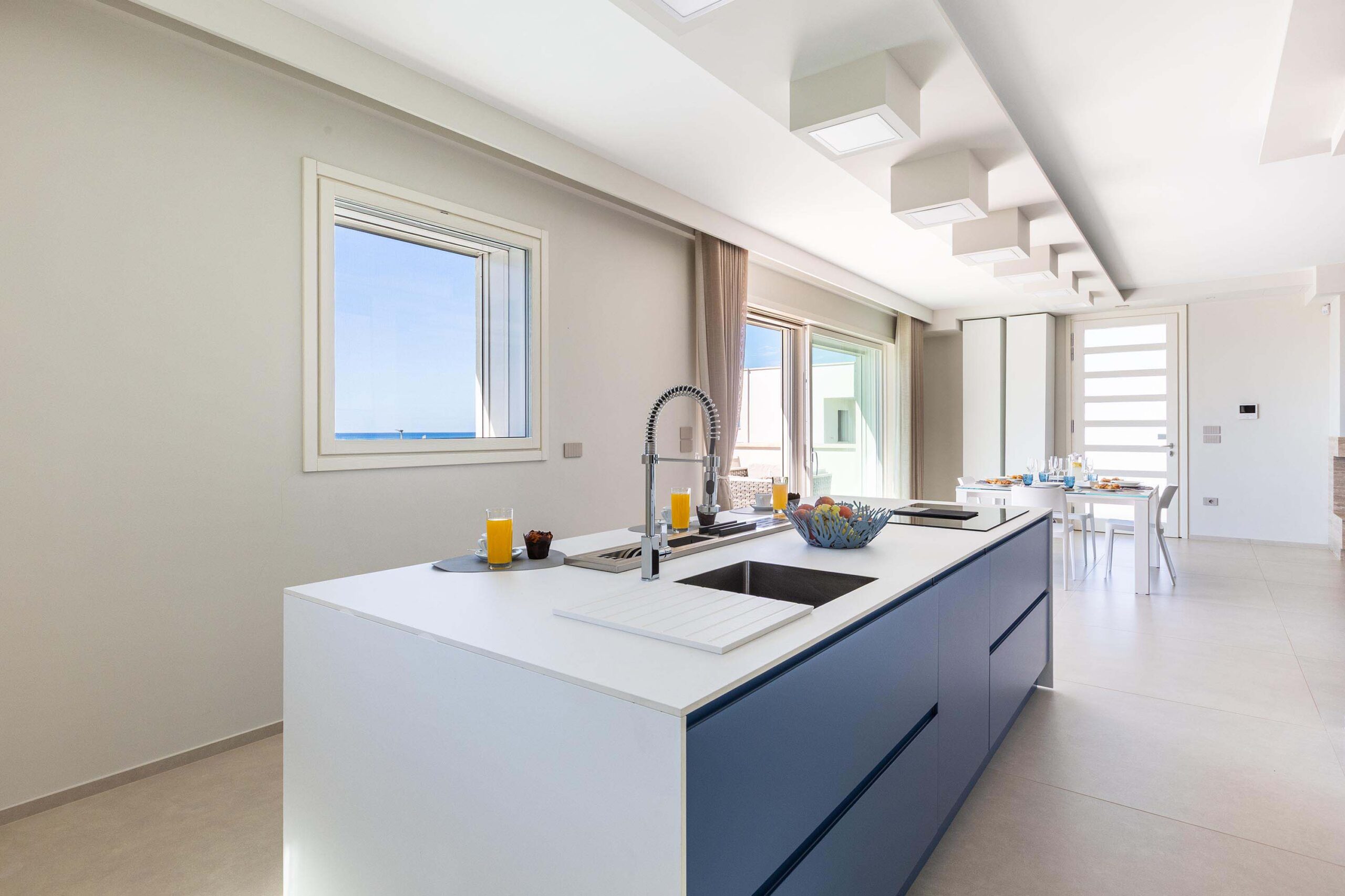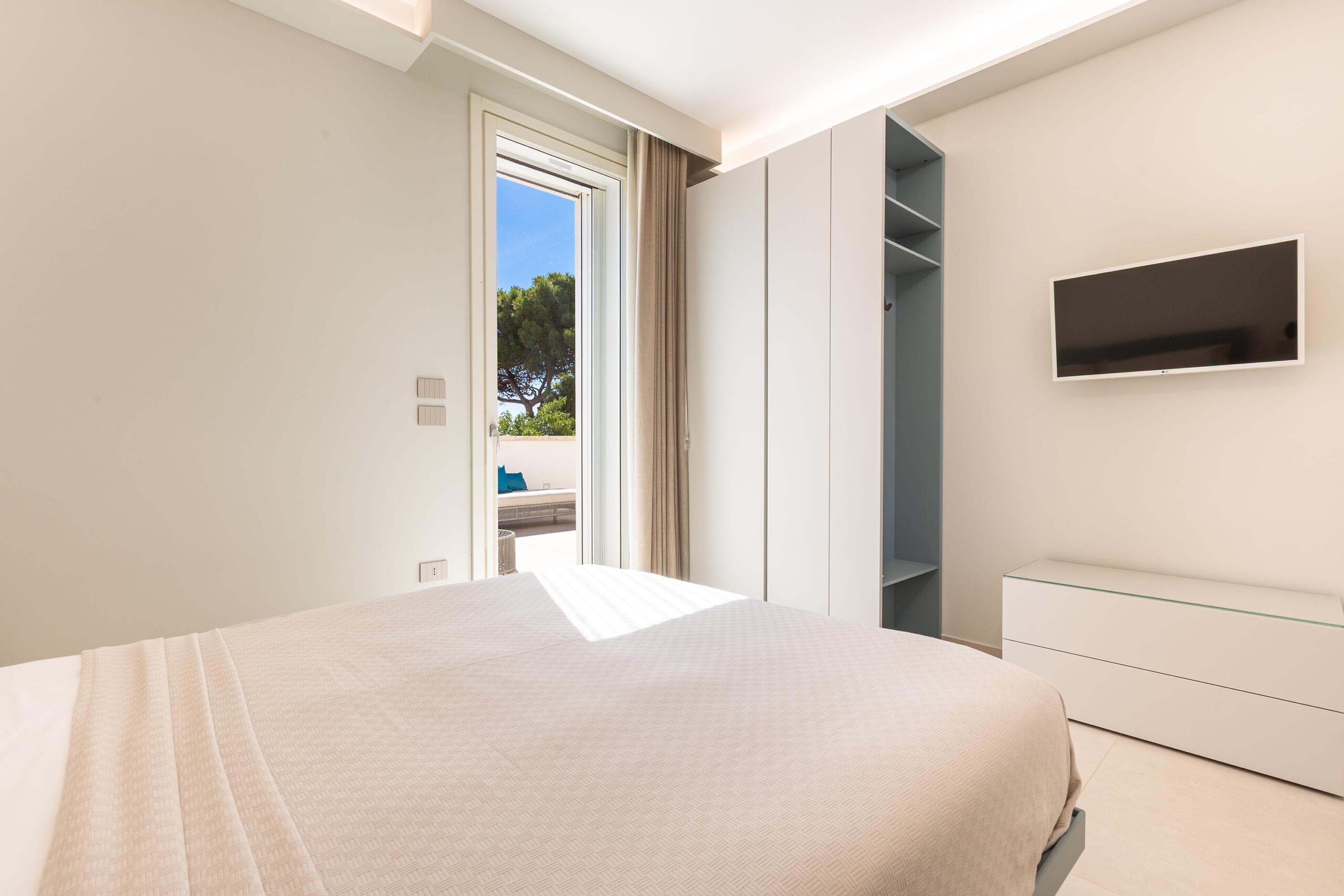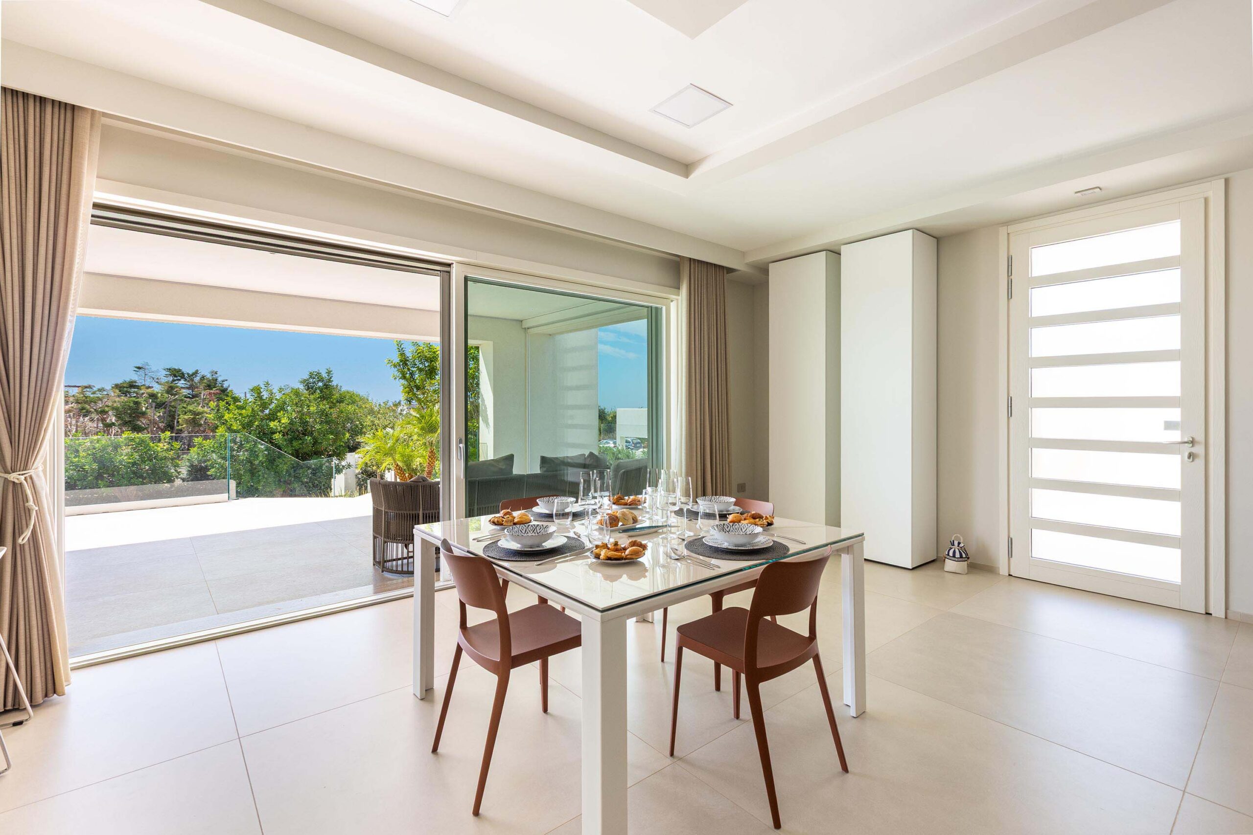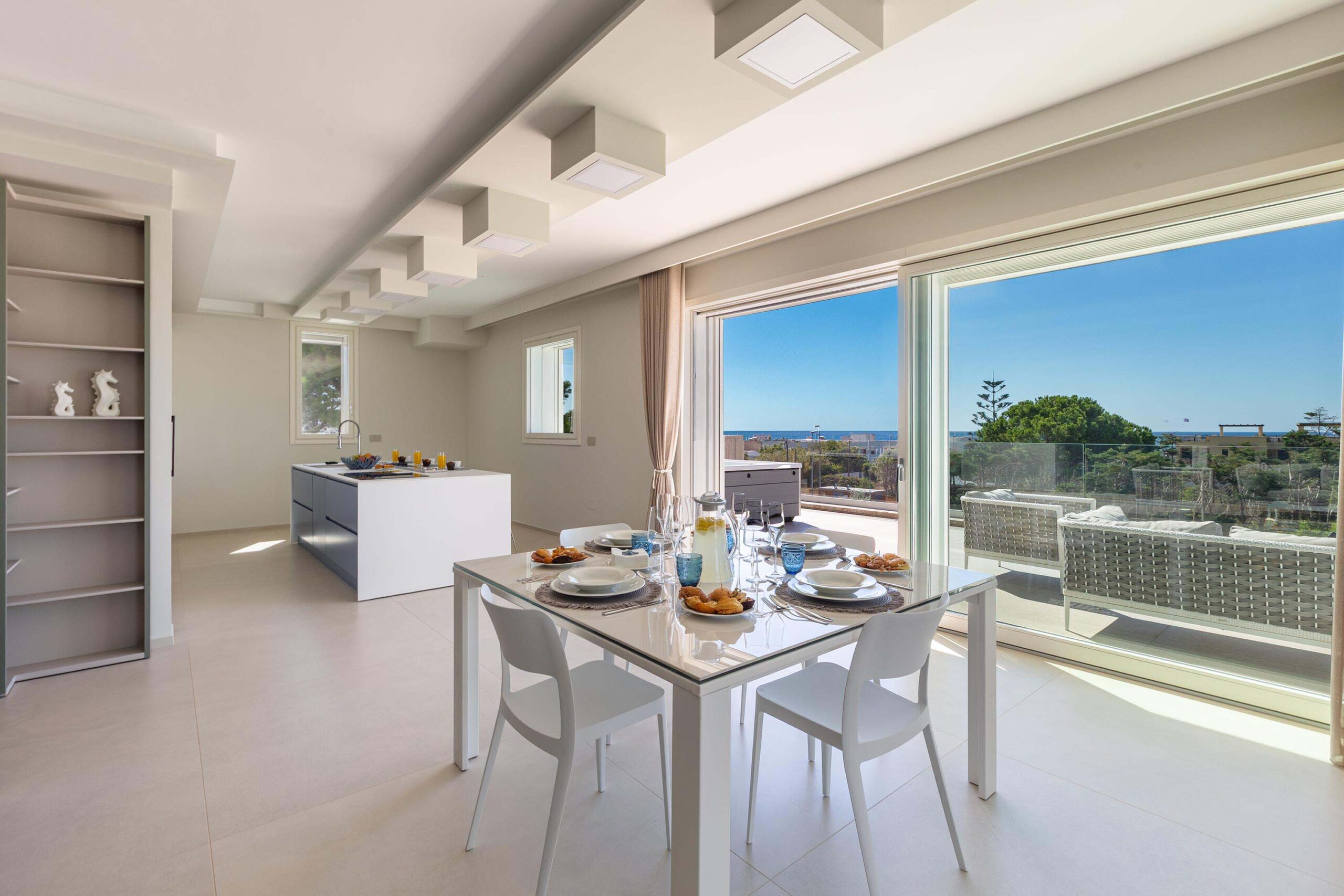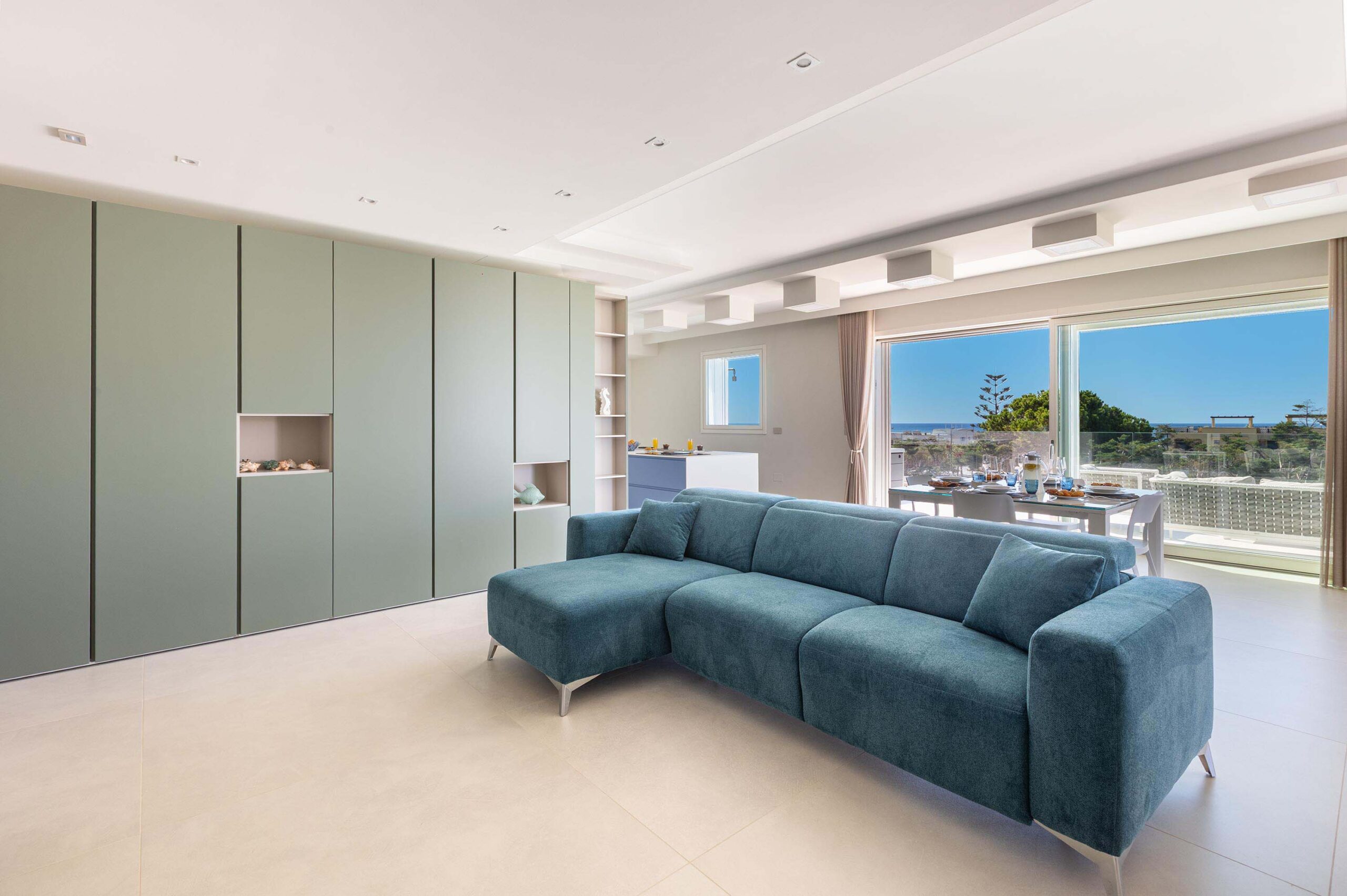La luce filtra dalle ampie vetrate e scorre sulle superfici chiare come un riflesso del mare, creando un’atmosfera di benessere e sofisticata semplicità. Gli spazi esterni — piscina, giardino mediterraneo e veranda ombreggiata — invitano a vivere all’aperto, immersi in una quiete elegante e rigenerante.