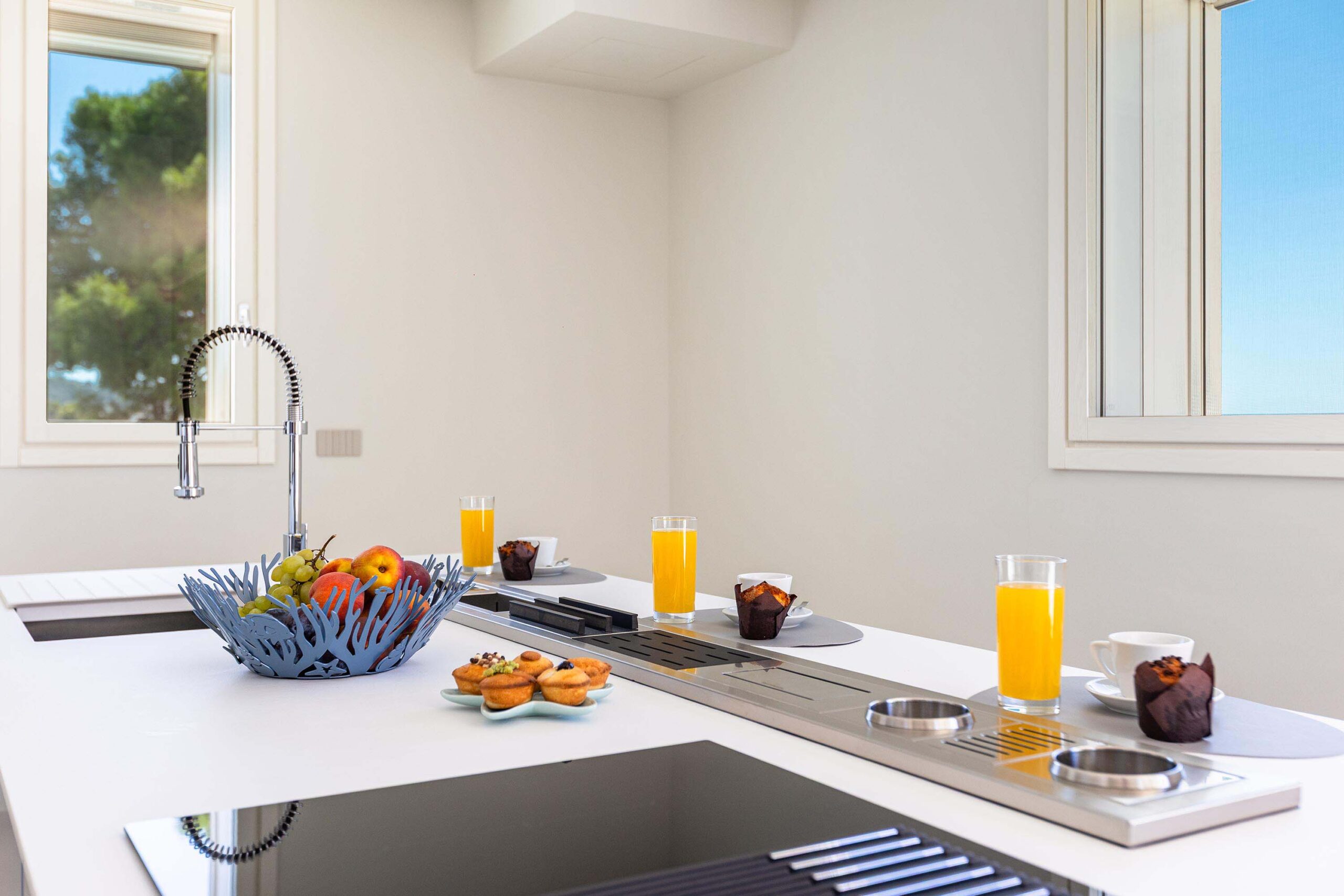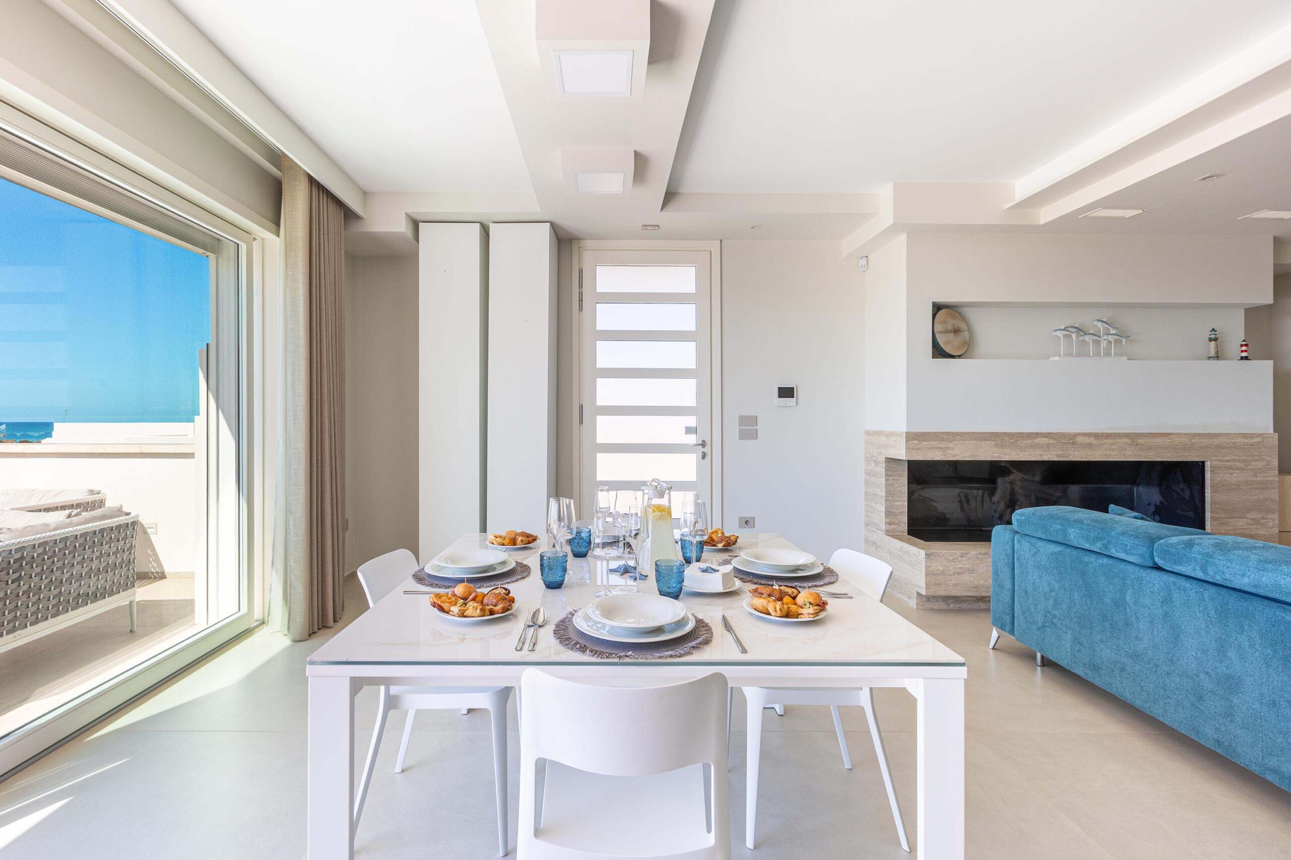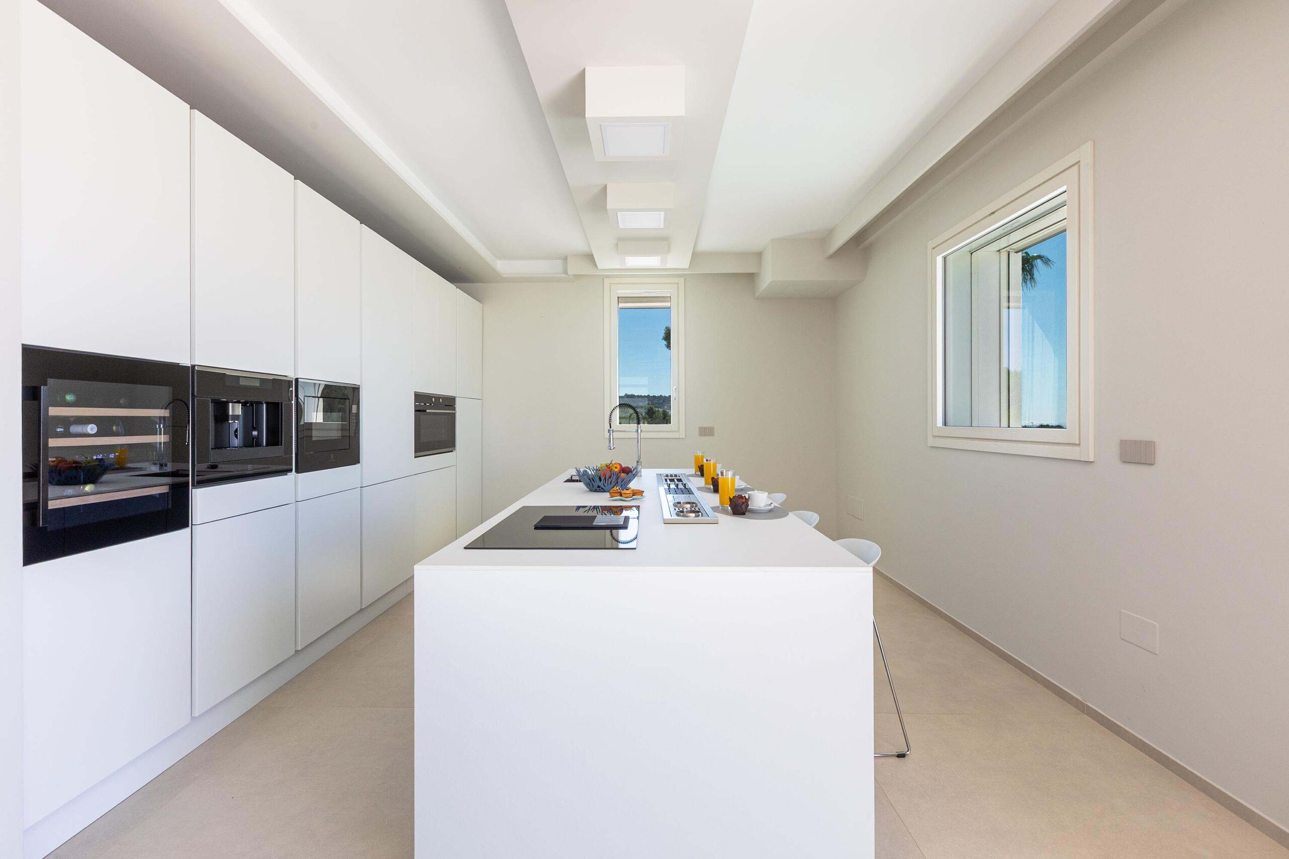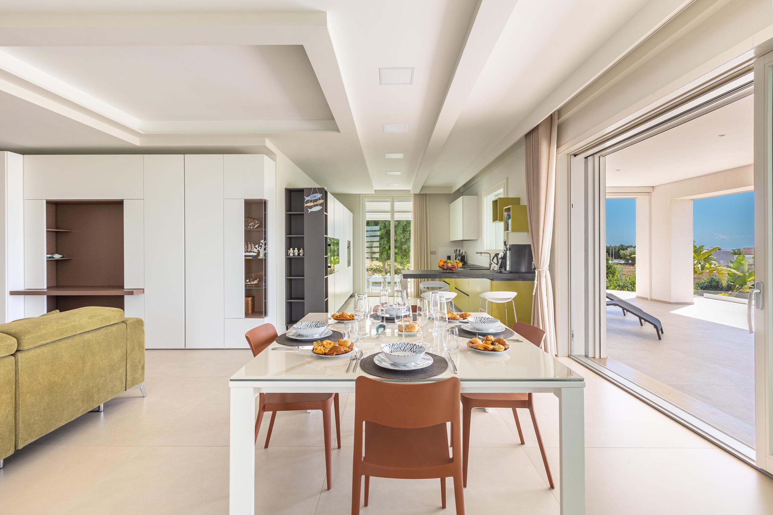 La luce filtra dalle ampie vetrate e scorre sulle superfici chiare come un riflesso del mare, creando un’atmosfera di benessere e sofisticata semplicità. Gli spazi esterni — piscina, giardino mediterraneo e veranda ombreggiata — invitano a vivere all’aperto, immersi in una quiete elegante e rigenerante.