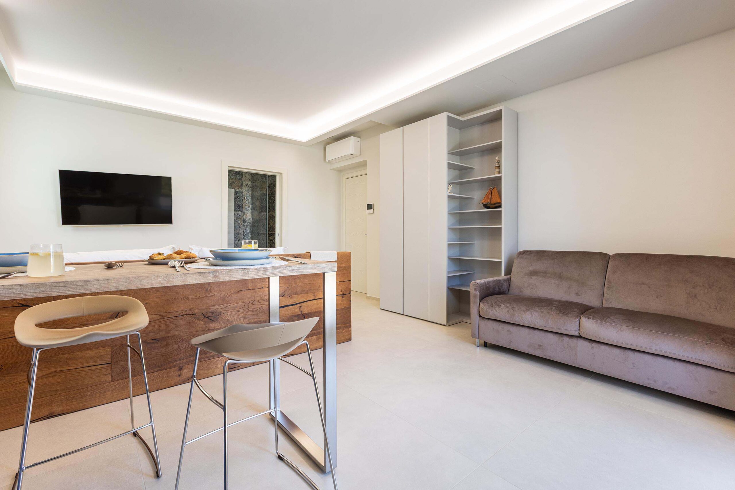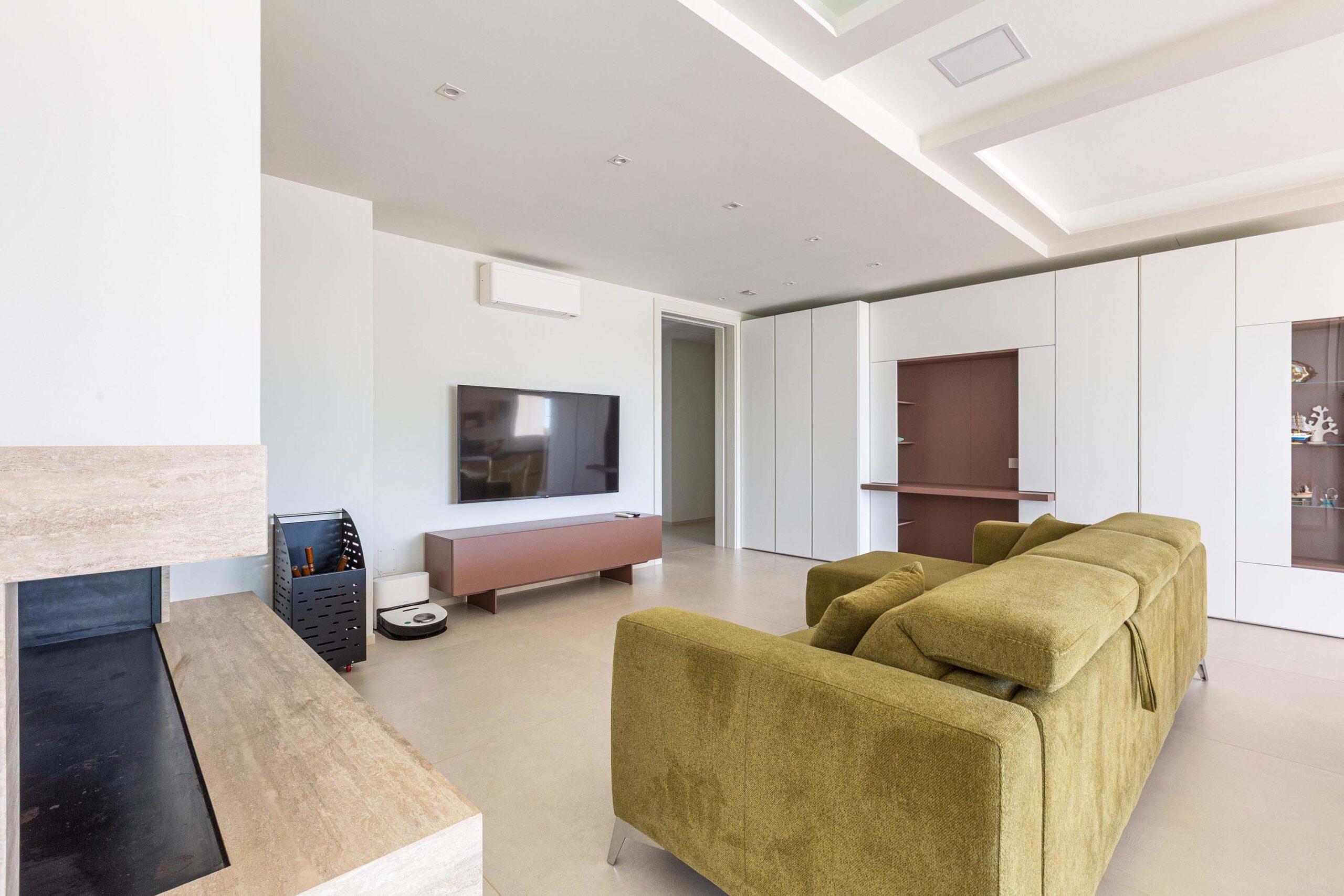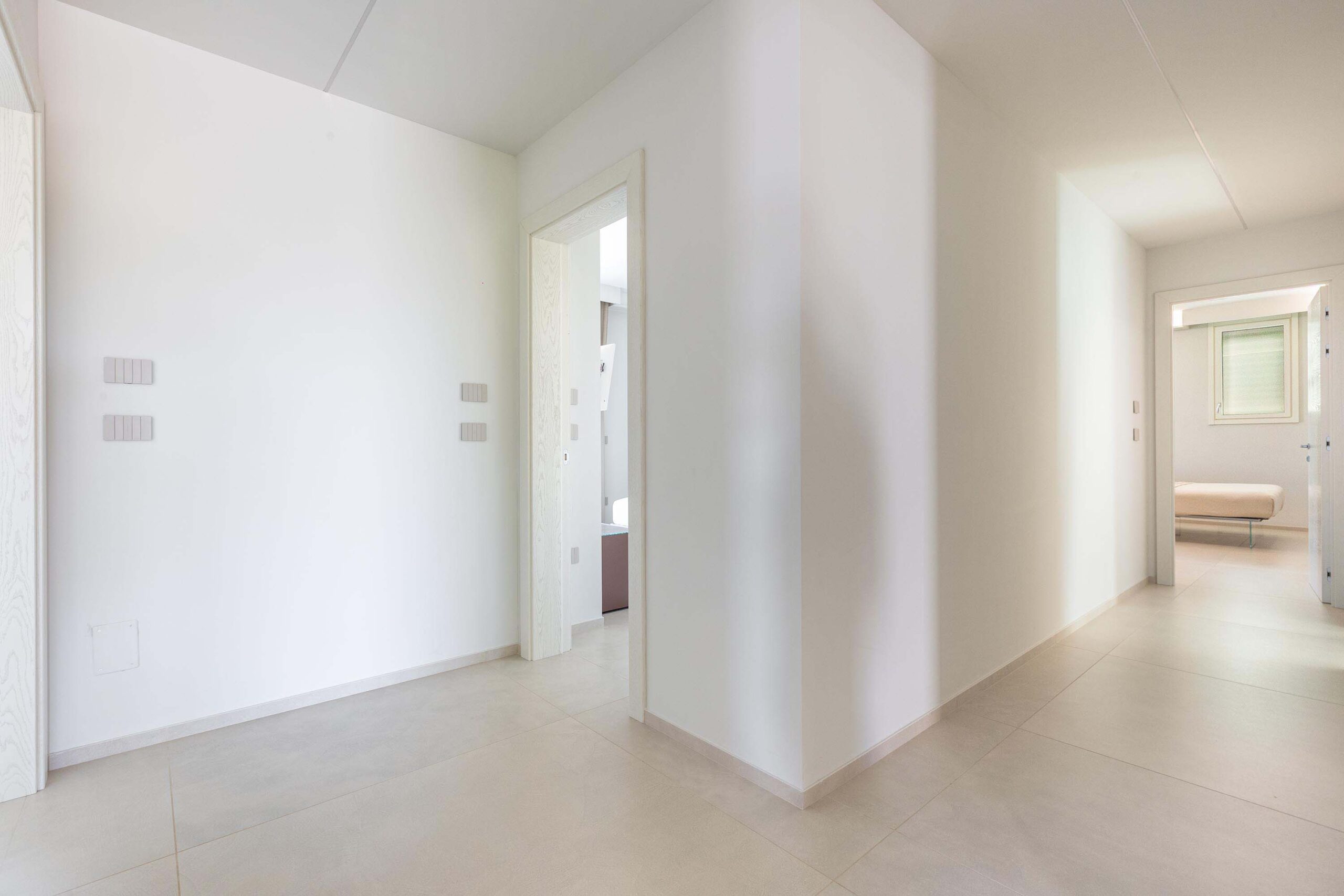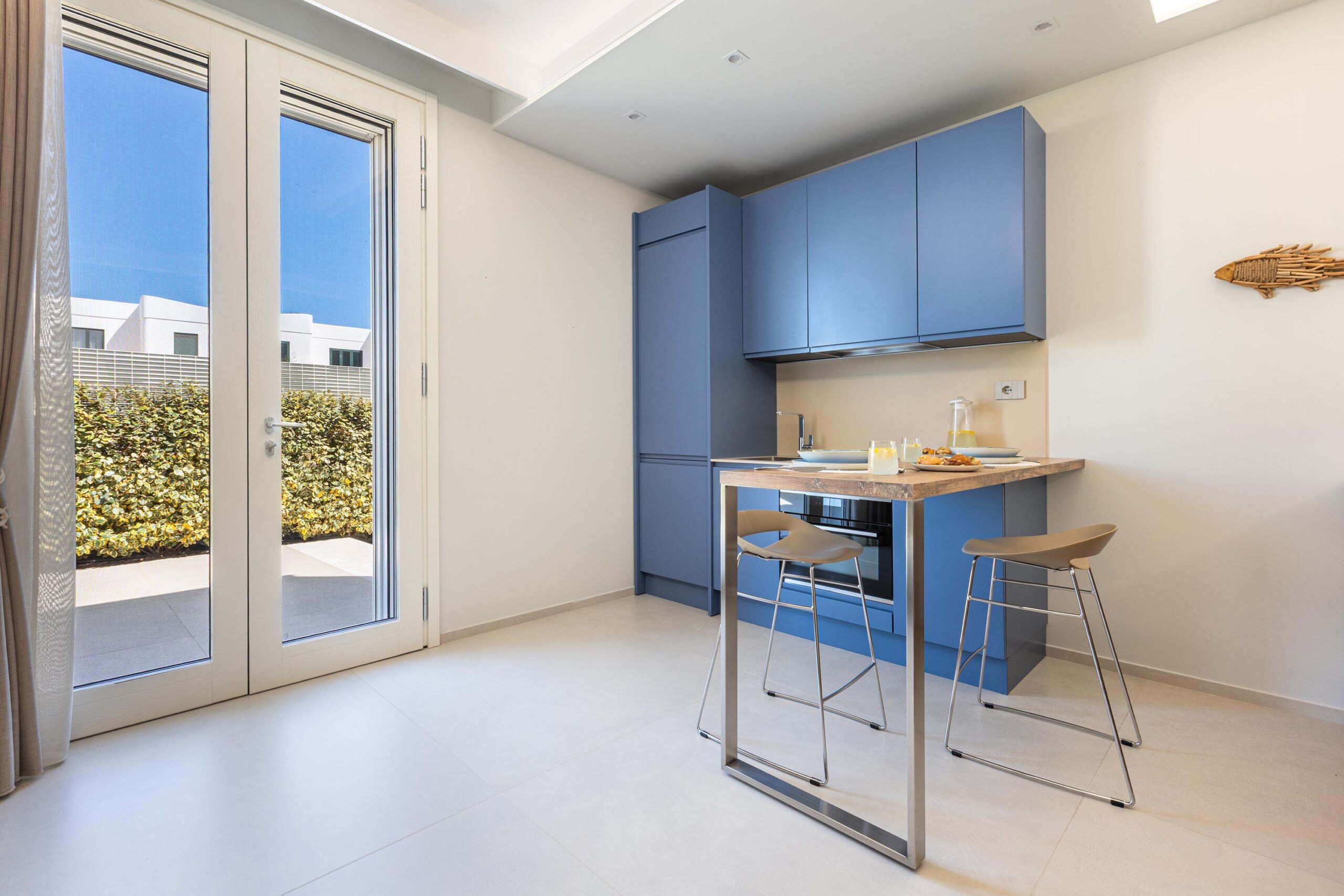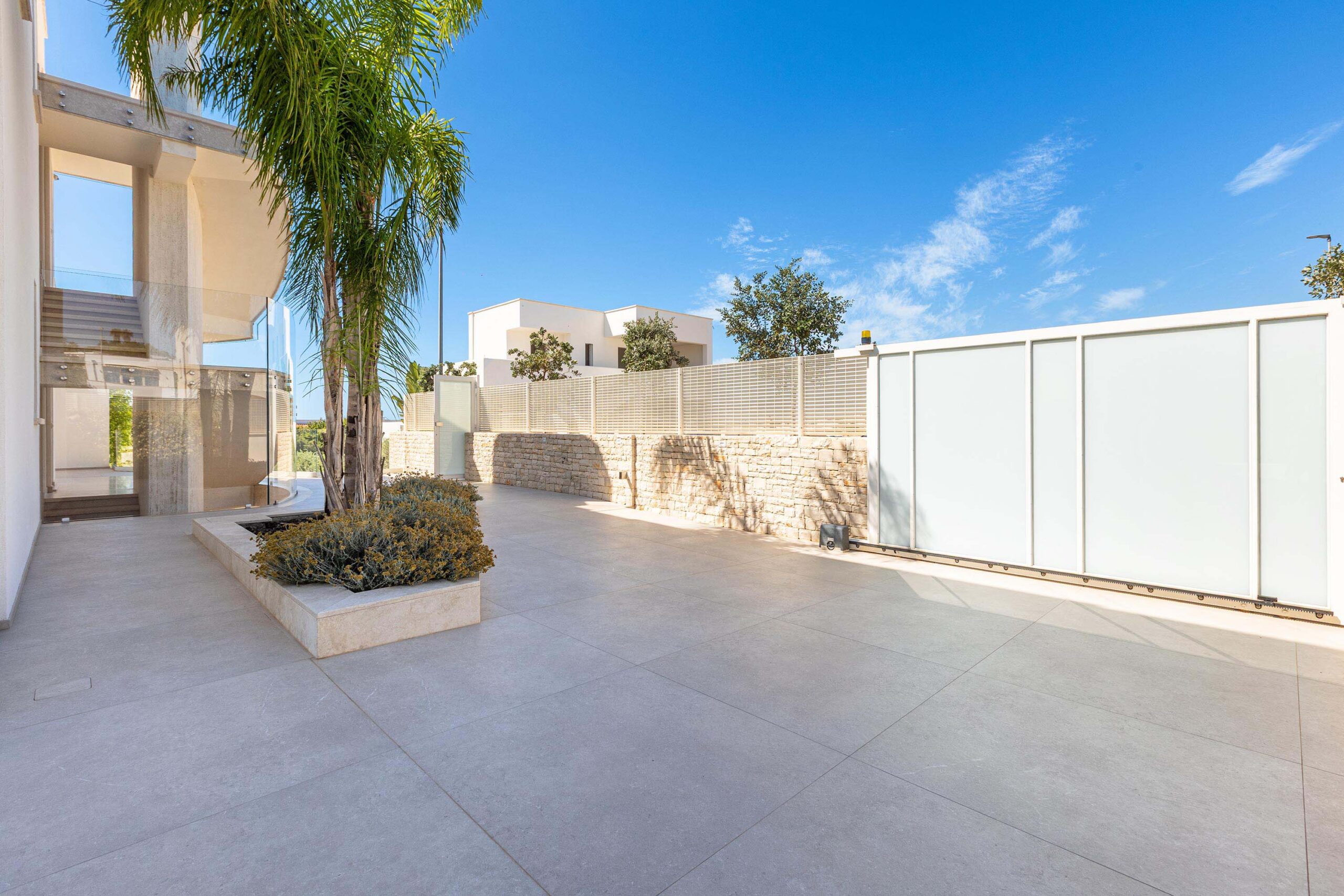 La luce filtra dalle ampie vetrate e scorre sulle superfici chiare come un riflesso del mare, creando un’atmosfera di benessere e sofisticata semplicità. Gli spazi esterni — piscina, giardino mediterraneo e veranda ombreggiata — invitano a vivere all’aperto, immersi in una quiete elegante e rigenerante.