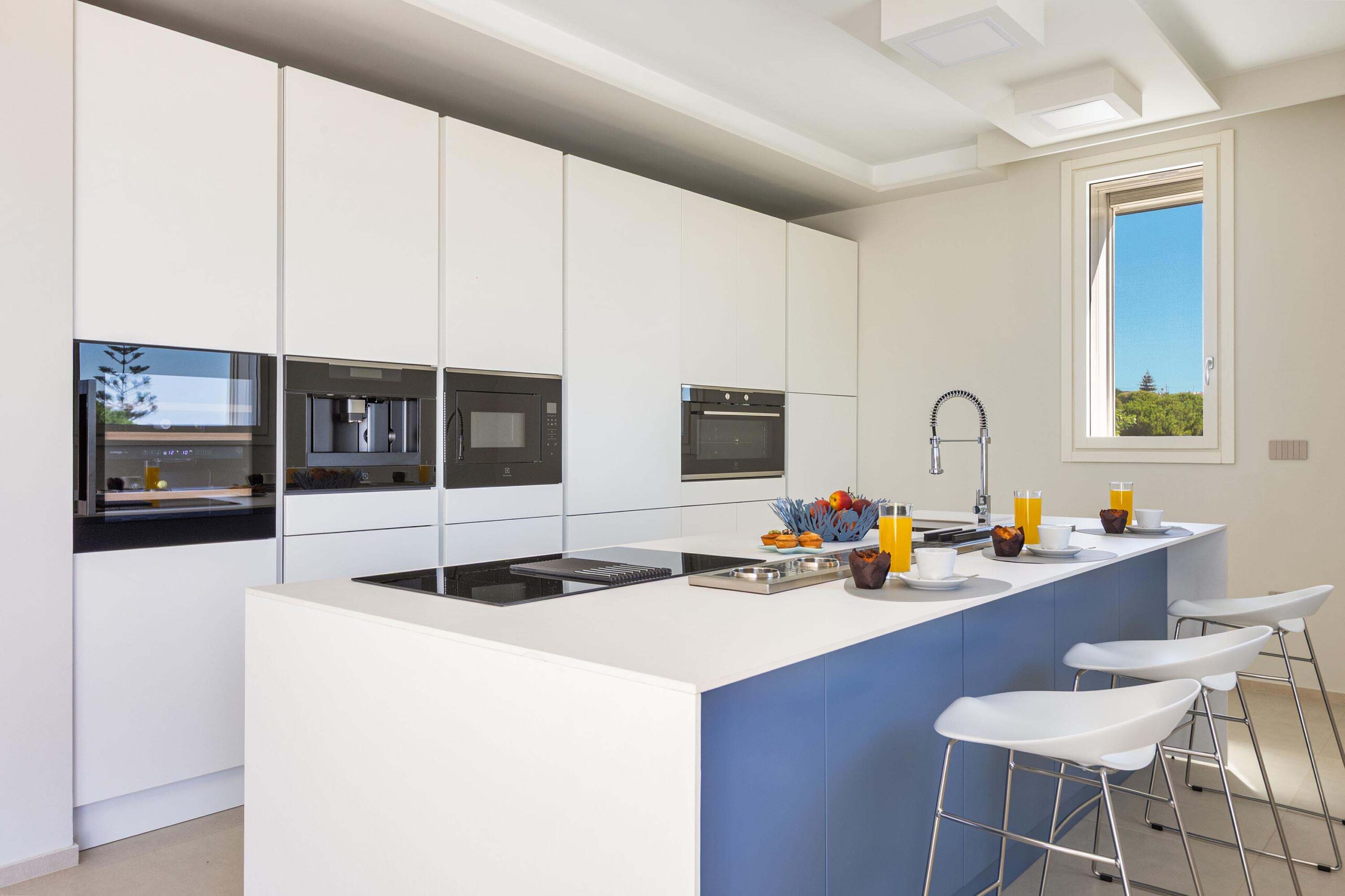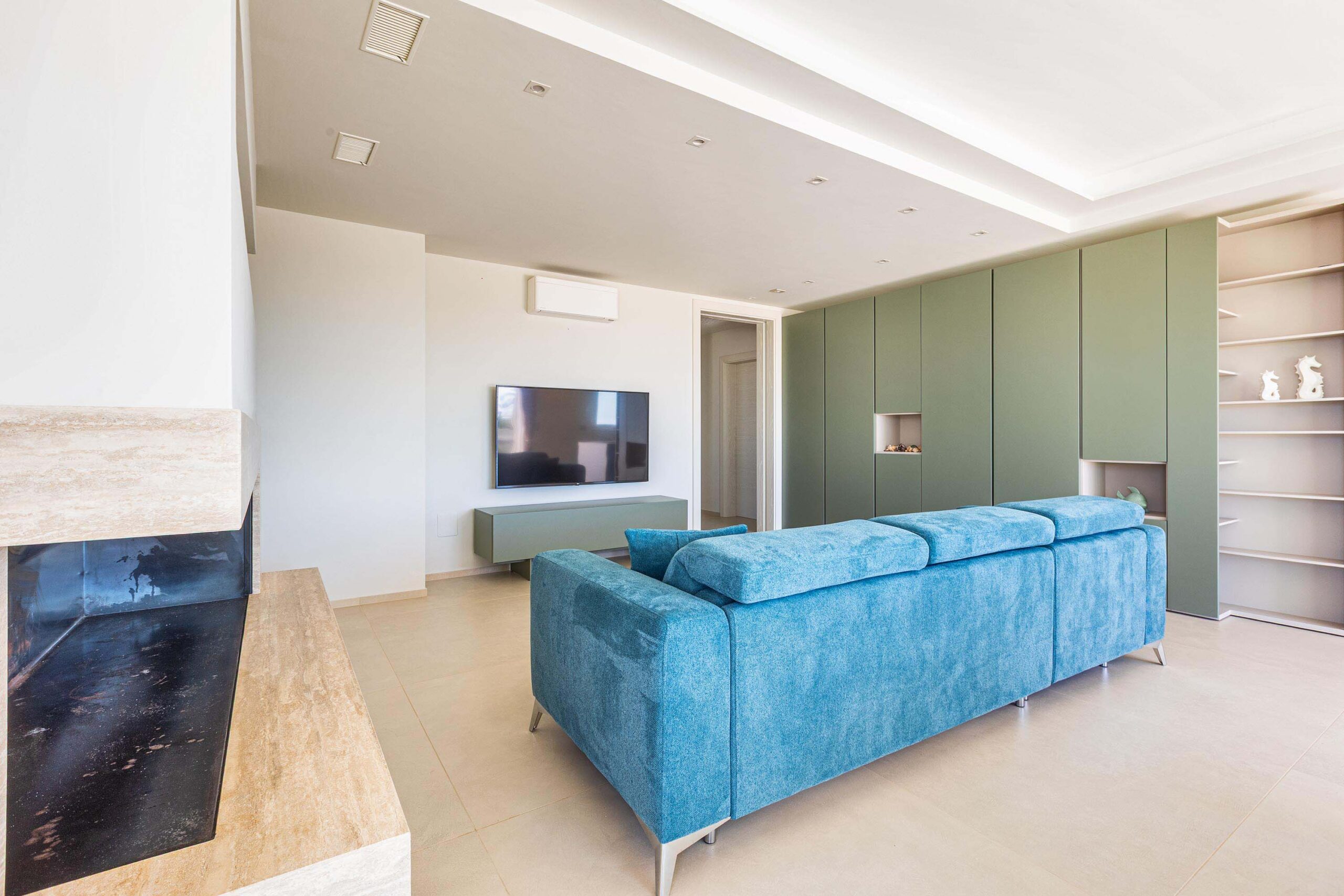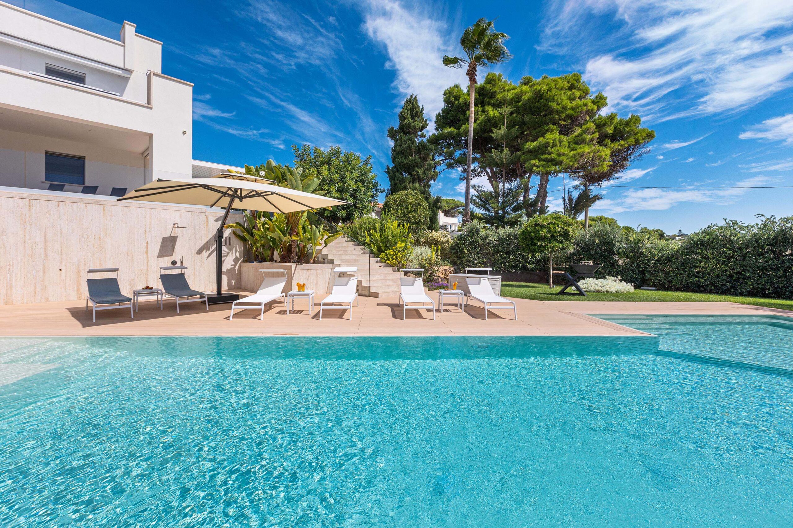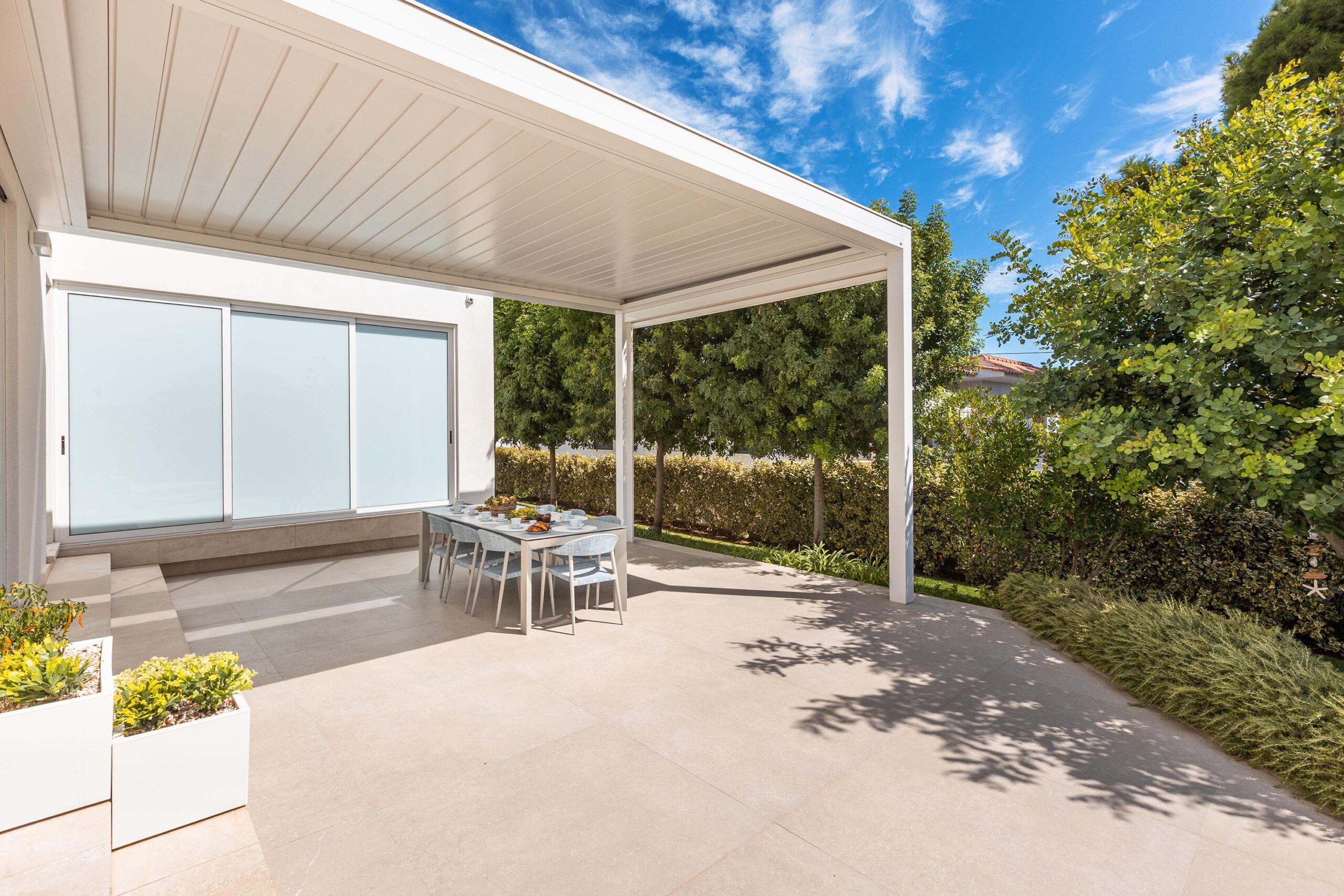 La luce filtra dalle ampie vetrate e scorre sulle superfici chiare come un riflesso del mare, creando un’atmosfera di benessere e sofisticata semplicità. Gli spazi esterni — piscina, giardino mediterraneo e veranda ombreggiata — invitano a vivere all’aperto, immersi in una quiete elegante e rigenerante.
