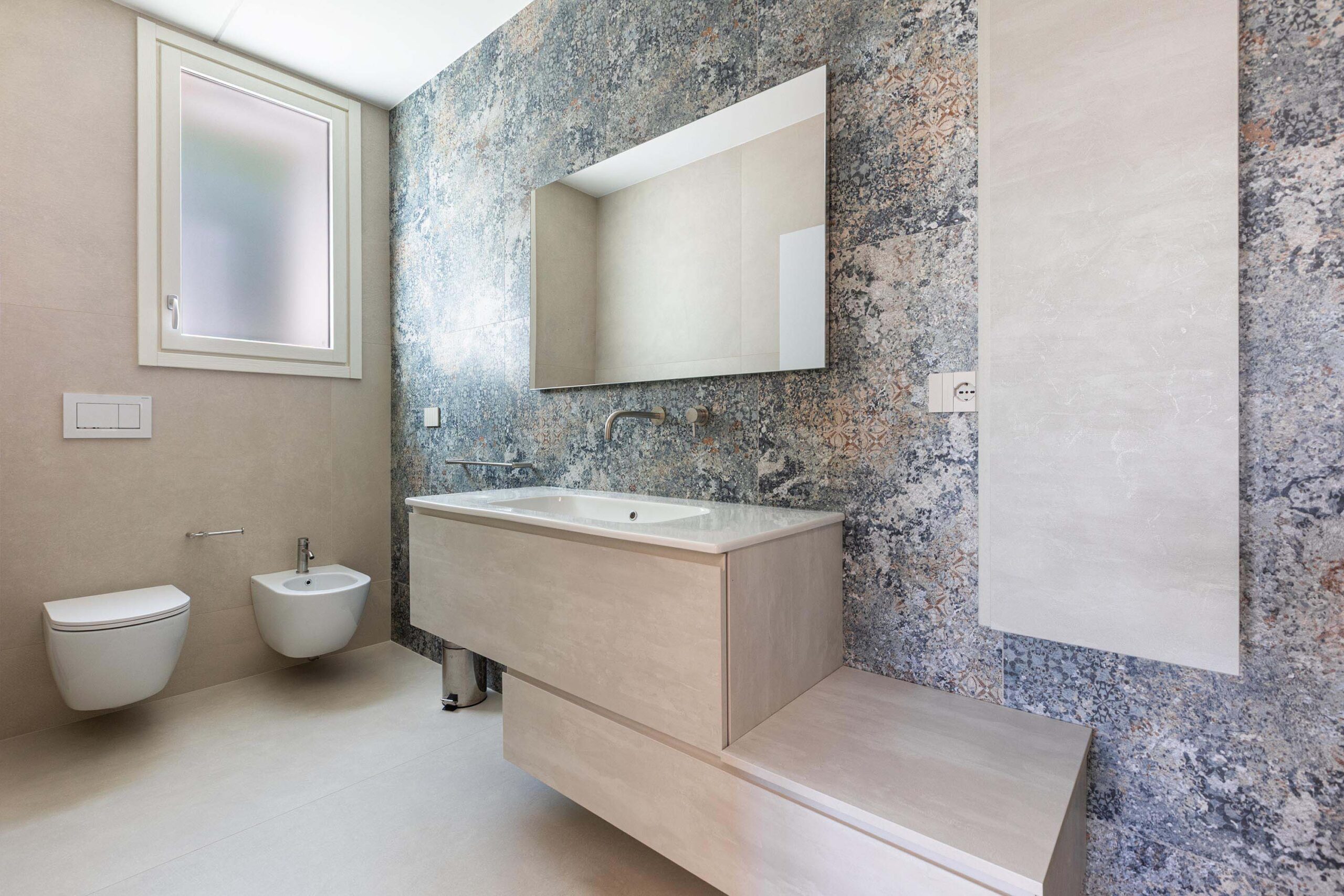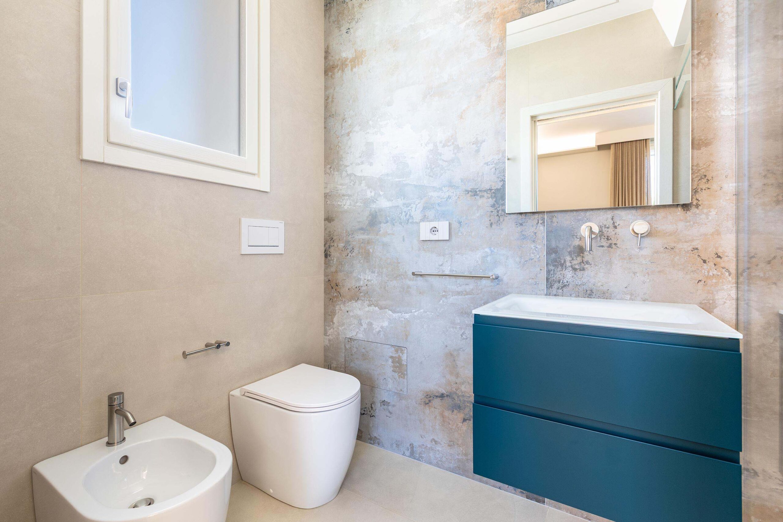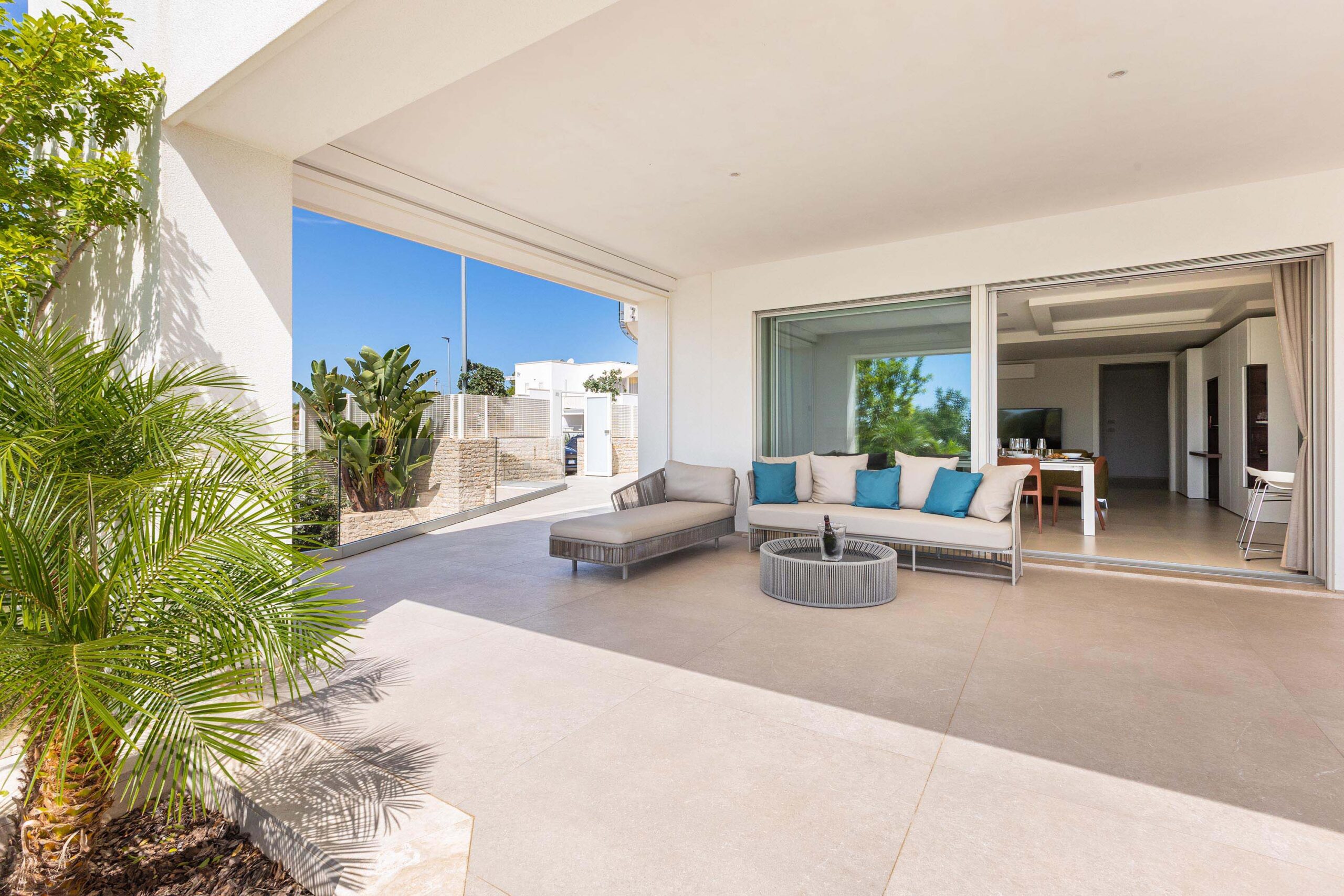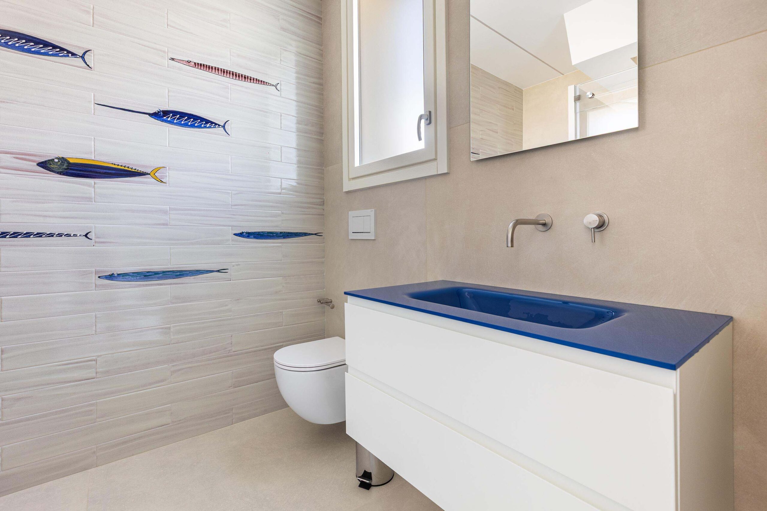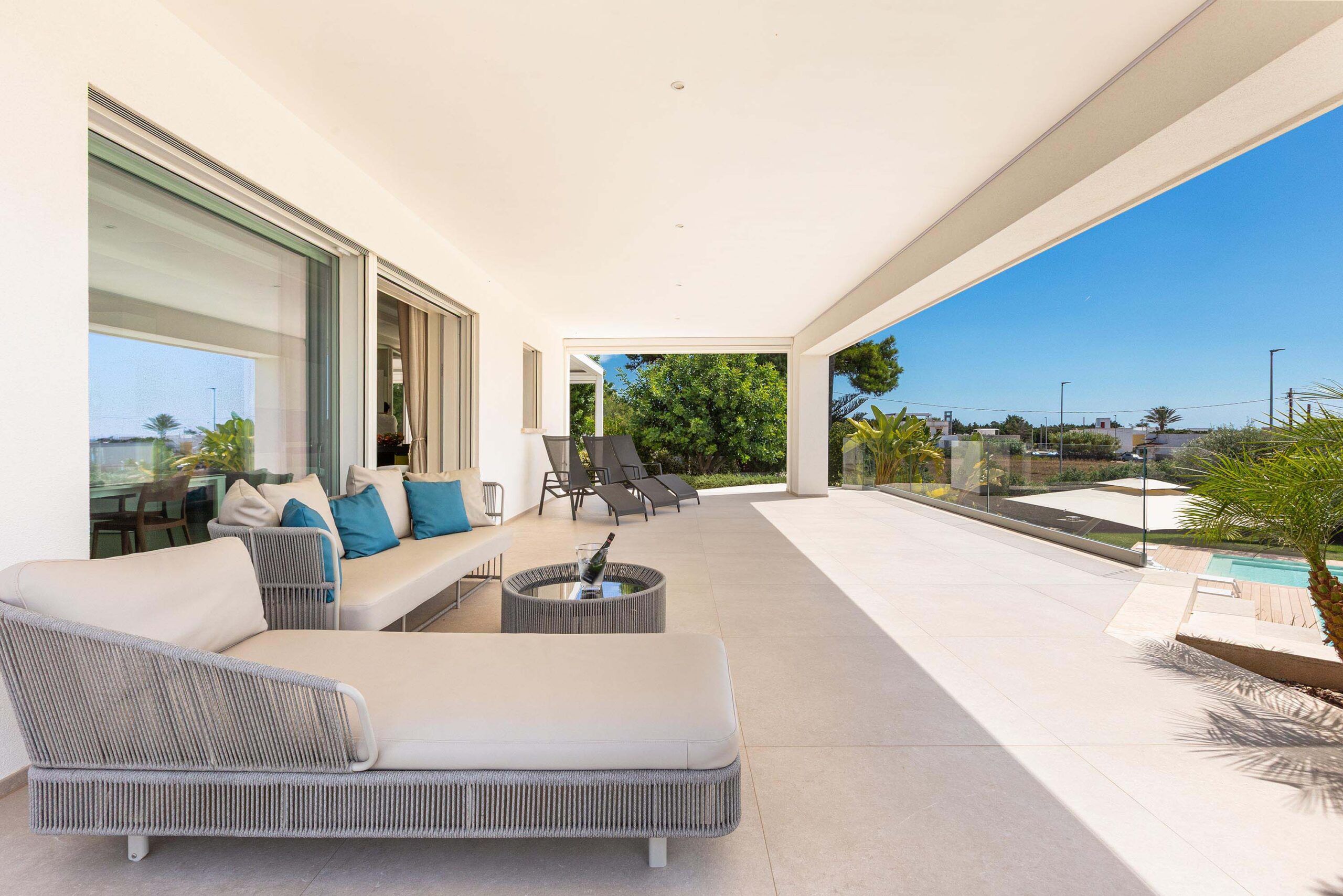 La luce filtra dalle ampie vetrate e scorre sulle superfici chiare come un riflesso del mare, creando un’atmosfera di benessere e sofisticata semplicità. Gli spazi esterni — piscina, giardino mediterraneo e veranda ombreggiata — invitano a vivere all’aperto, immersi in una quiete elegante e rigenerante.
